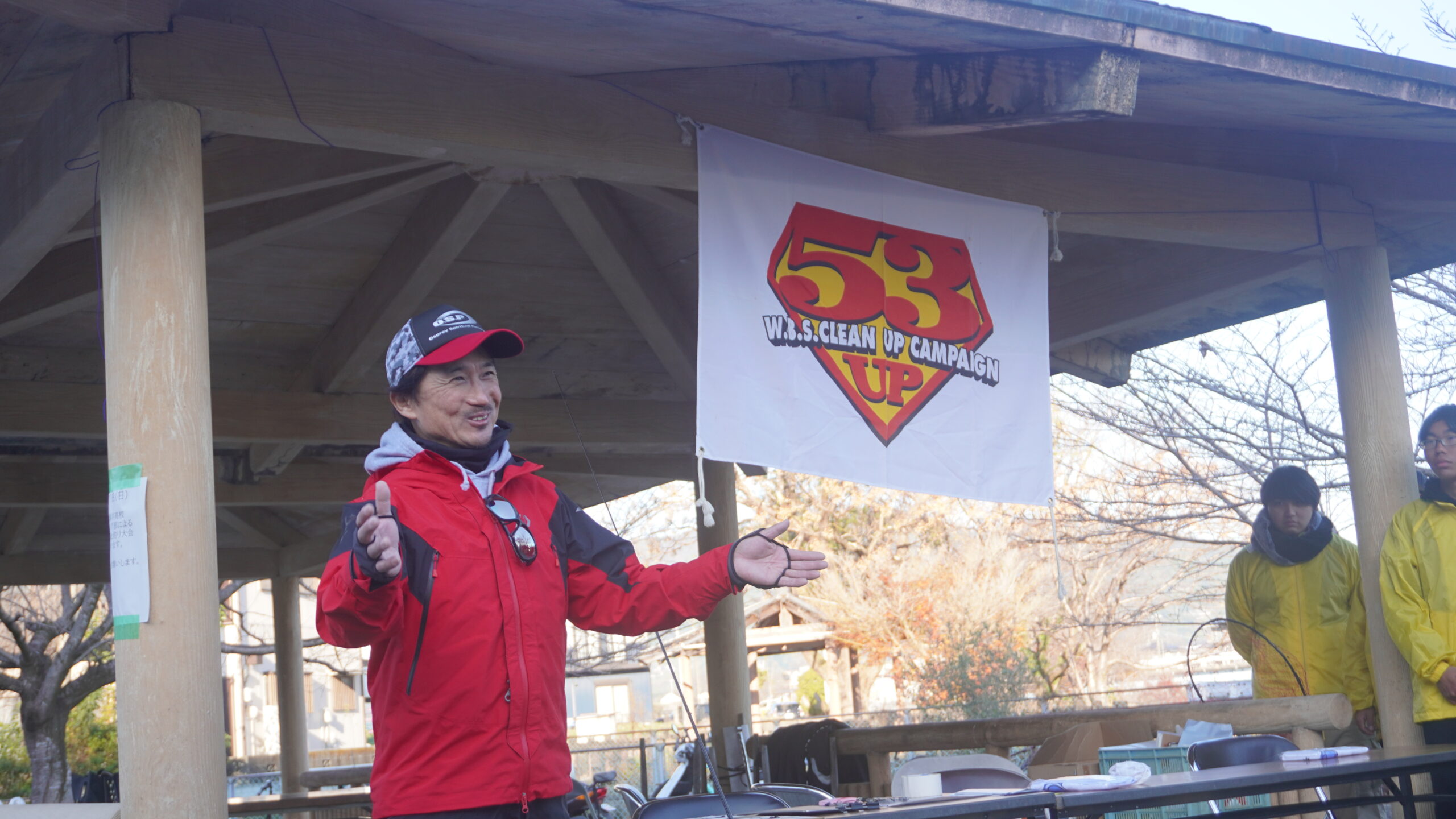 開催当日は晴天で朝は寒かったものの日中は暖かく、絶好の釣り日和での開催となりました。また当日は並木プロの人気のおかげで 65 名の方々に参加していただき、清掃活動、バス釣り大会を通して盛り上がる事ができました。