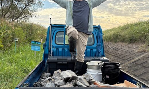 6月1日(日) 植生浄化施設の石積み堤に砕石投入。森谷、吉田の2名。